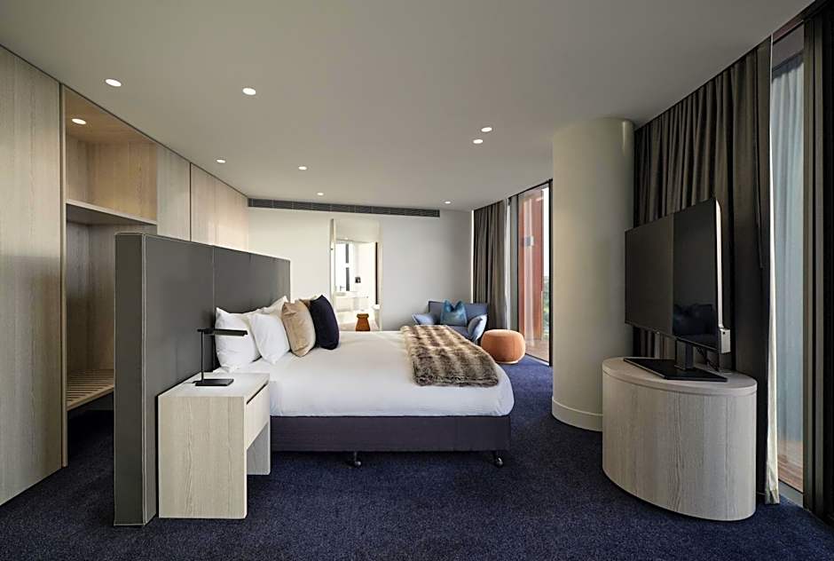 This suite features a balcony with panoramic views of Port Phillip Bay and Bass Strait. It also comes with a free standing spa bath, Nespresso coffee machine, and pillow menu.
