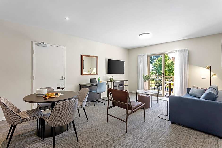 Two-Bedroom Apartment Ideal for families or small groups, the Two Bedroom Apartment provides a perfect blend of space and privacy. One of the bedrooms has its own Smart TV and air-conditioning and the second bedroom can be configured as either a king or twin beds, while the bathroom contains a shower over bathtub and laundry facilities. A fully equipped kitchen featuring an oven, cooktop, a full-size fridge and a dining table means meals can be prepared and enjoyed in the apartment. Enjoy some fresh air on the private balcony. Guests can access the swimming pool and alfresco area. A daily housekeeping service is included (excluding Sunday and public holidays). Breakfast and restaurant options are available.