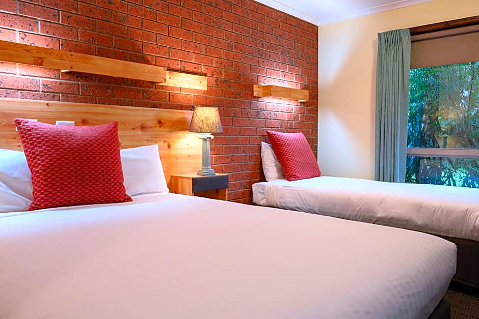 Includes stairs leading to a loft bedroom (with 3 single beds) overlooking the motel facilities. This room has no capacity for extra guests.