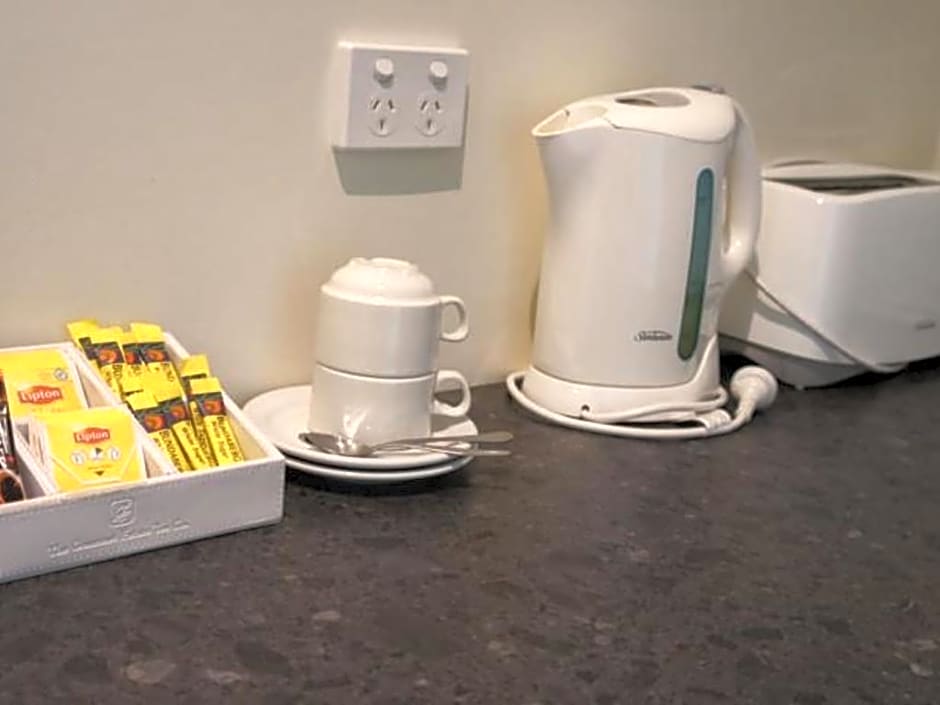 This room features modern designed en suite with complimentary toiletries. Also available in each room is a hairdryer, toaster, tea and coffee making facilities, flat-screen TV, a 2 seater couch and desk area. There is a small hanging space, and an iron and ironing board are available upon request.