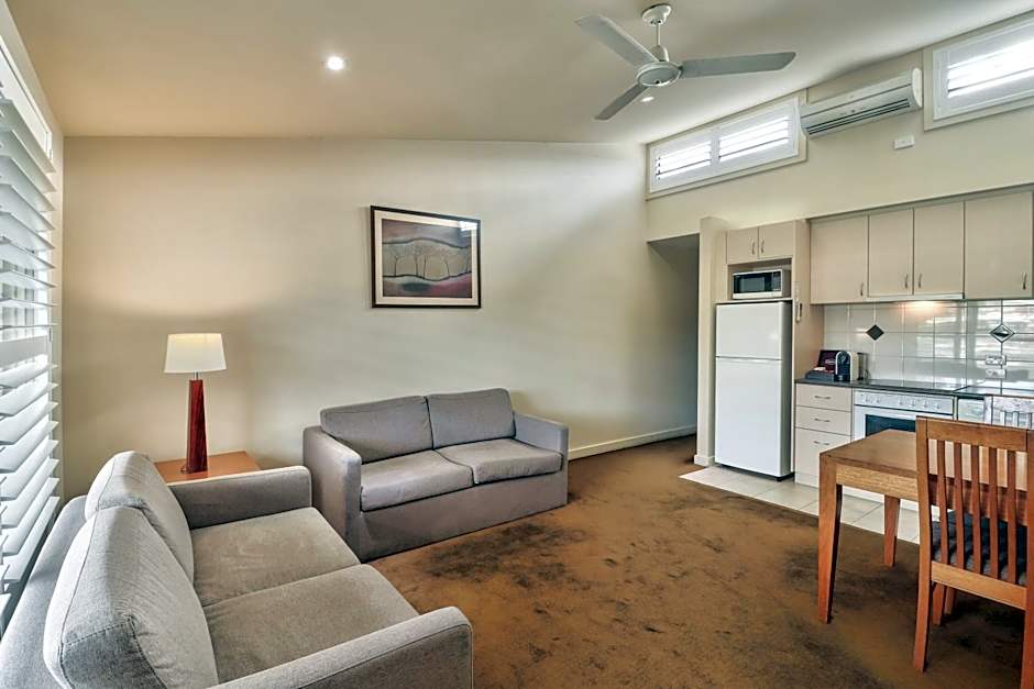 This apartment features full cooking facilities, lounge room and corner spa bath. This Standard apartment features a cozy living room and includes full cooking facilities, a comfortable lounge area, and a luxurious bathroom with a corner spa bath and a shower over the spa.