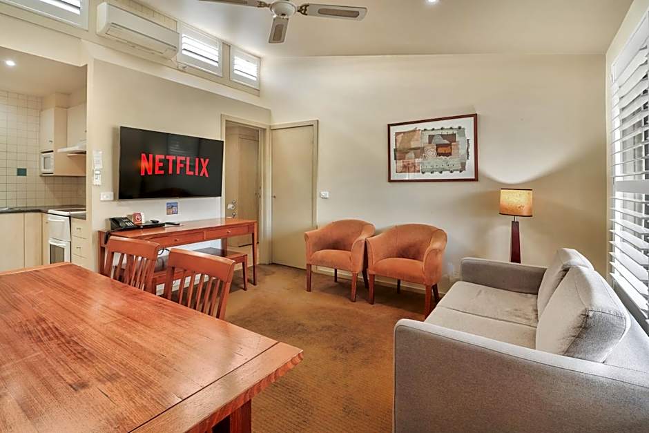 Located on Level One, this fully self-contained and spacious apartment is accessible via stairs. It features a well-appointed bathroom with a corner spa bath, a fully equipped kitchen, a dining area, and a comfortable lounge. Enjoy scenic views of the surrounding area from this inviting retreat.