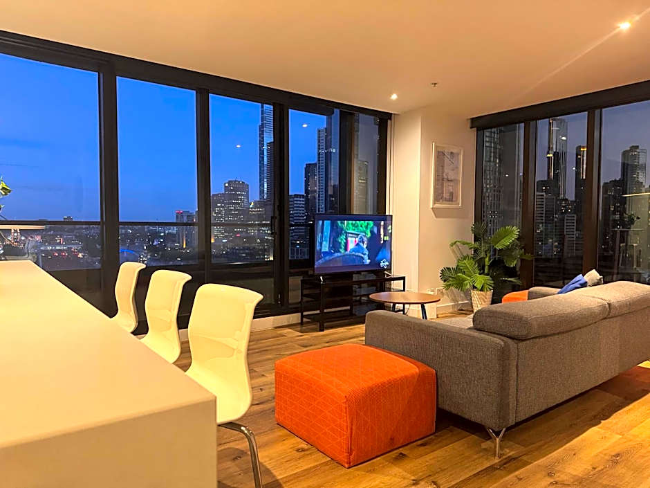 Spacious two bedroom apartment with magnificent views across the Southbank area of Melbournes CBD. Well appointed kitchen & full glass wall of windows / sliding door enabling us to enjoy the view from either inside the lounge & bedrooms or from out on the balcony. We could see the Melbourne Aquarium & Crown Towers just across the Yarra. Easy walking to the apartment from Southern Cross station as well as quick & easy access to the CBD & trams. Made visiting the NGV, Lume & the Immigration Museum easy!