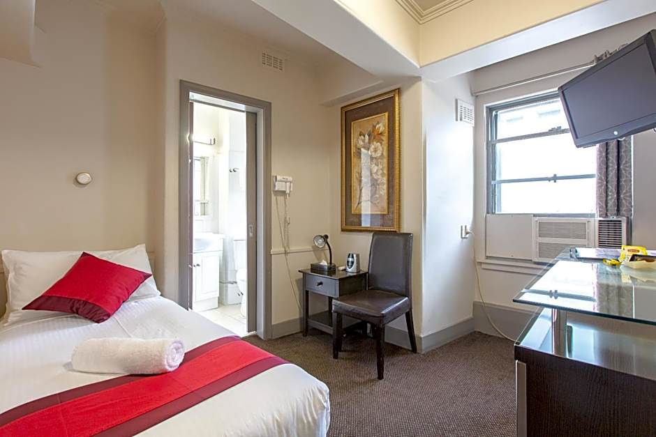 Spacious room overlooking Swanston St through tree branches: effort has been made to spruce up the room and the furnishings - successfully! Bed is super comfortable with good linen. Extra heater was a nice touch: great bathroom- immaculate shower & toilet. Adequate bath linen.