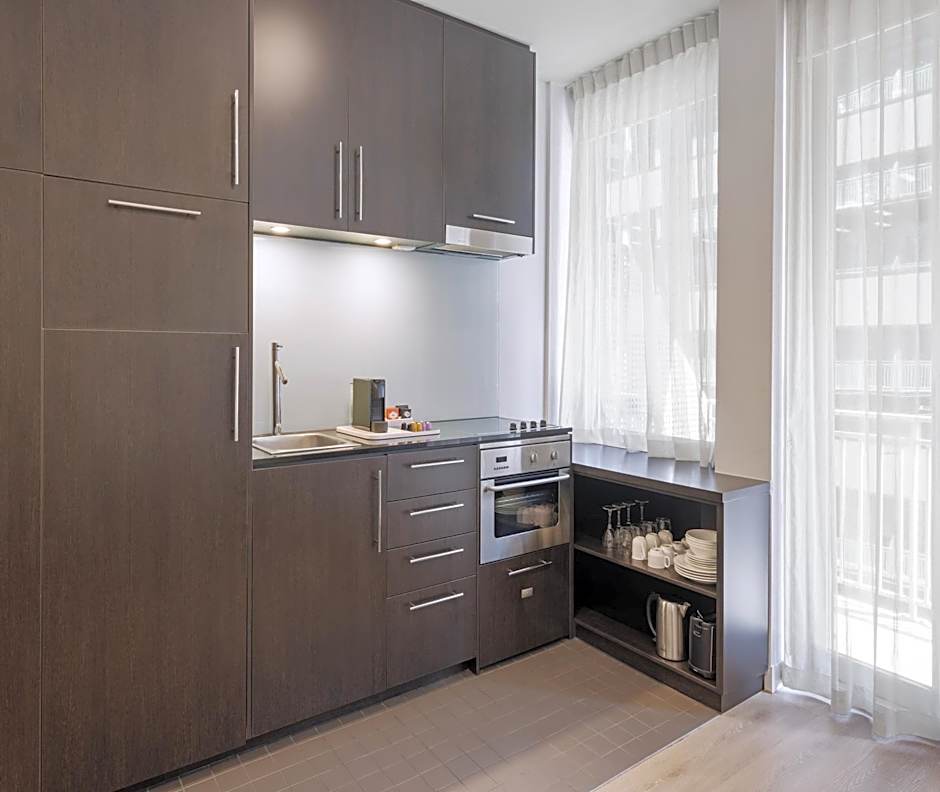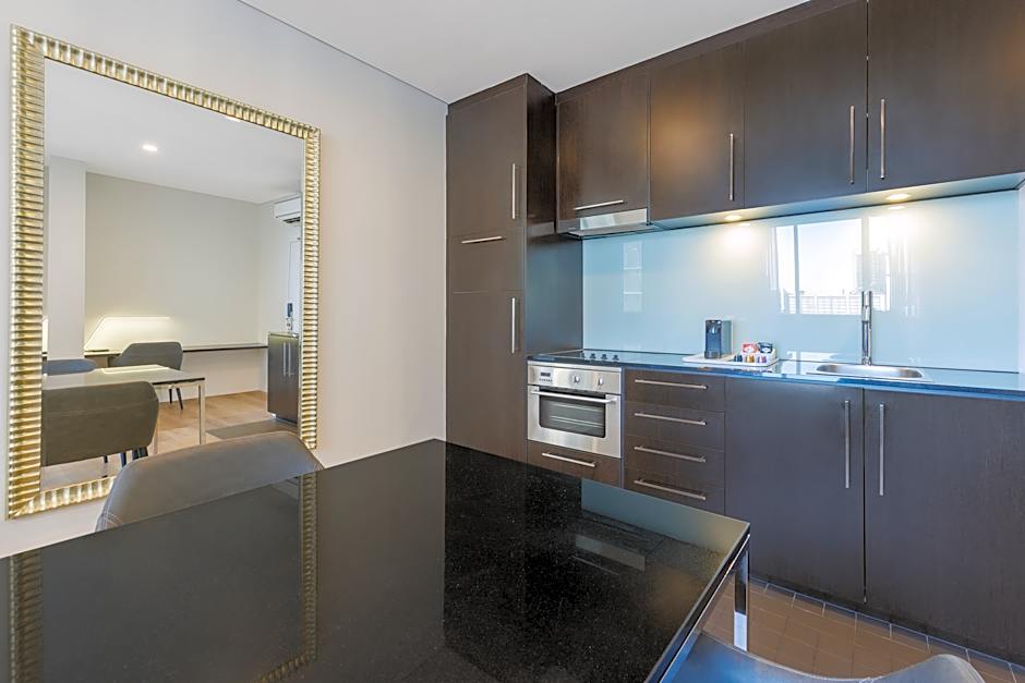 Located on level 14 or higher, this Executive Studio apartment offer scenic views of lively Collins St. The room is equipped with a full kitchen and an LCD TV with cable channels.