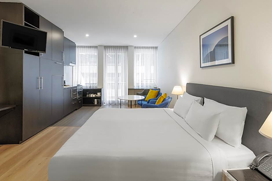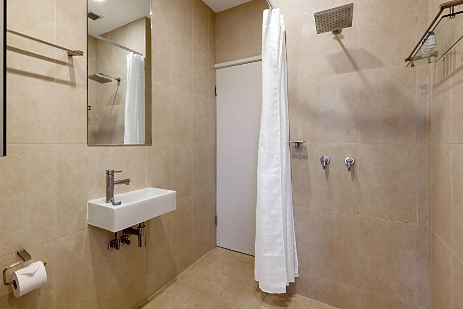 This spacious open-plan studio offers either views of Collins Street or a balcony overlooking St James Lane. Features includes a full kitchen and an LCD TV with cable channels.