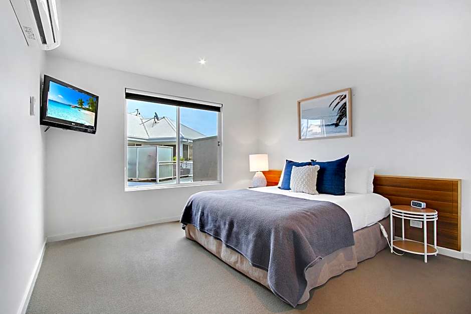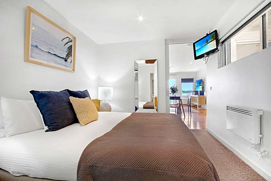 A luxuriously appointed ground floor apartment featuring a separate living area, king size latex bed and double shower. This room also features a private patio courtyard equipped with BBQ.