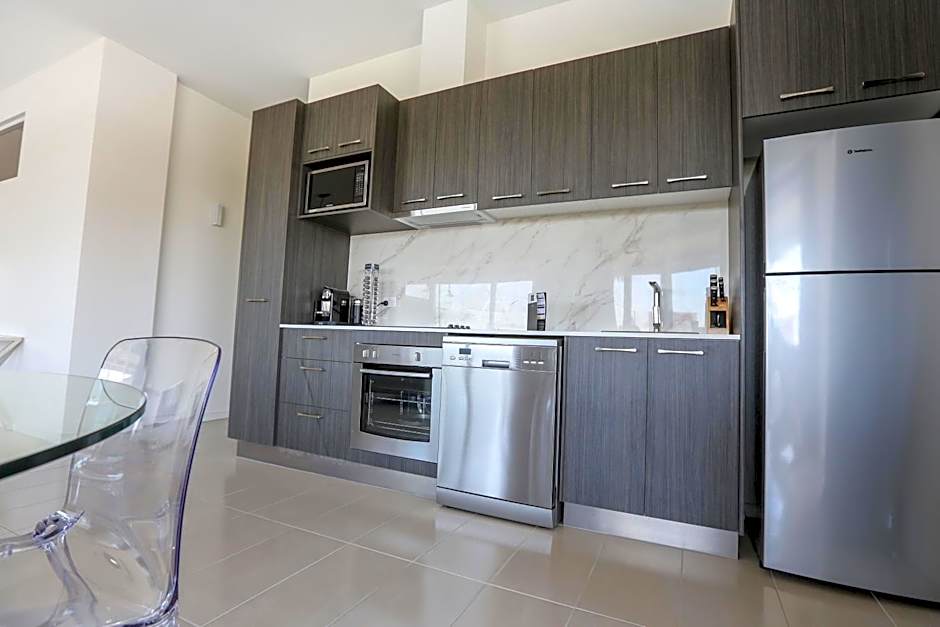 This one bedroom apartment features a large balcony and rattan outdoor setting. It has a king size bed, 42-inch plasma TV and private bathroom complete with complimentary bathroom amenities and separate powder room. It offers a spacious open plan living/dining area with contemporary furniture, leather modular lounge suite, dining setting, 50-inch LCD television, DVD player. It has a fully equipped kitchen with a stovetop, oven, microwave, dishwasher, stainless steel appliances and stone bench tops. Complimentary tea and instant coffee making provisions, and coffee pod machine (pods to be purchased through mini-bar). Mini-bar items available. Guests enjoy free WiFi.