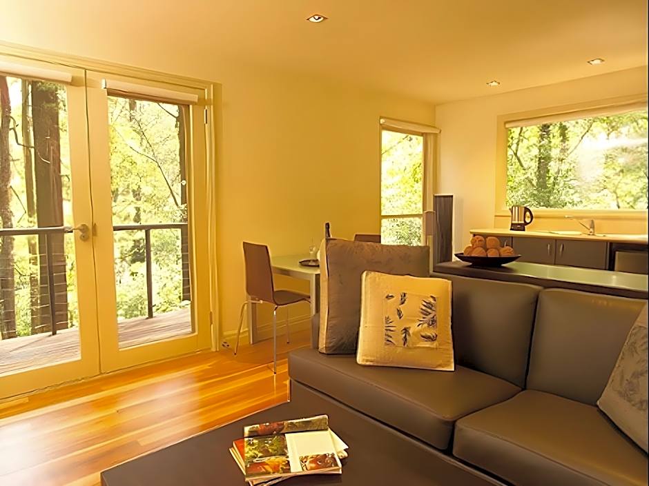 We got to stay in Treetop Cottage 1. It was in excellent condition, very clean and accommodating. Each level was spacious and cosy. Also great outdoor views from each level. It was relaxing to spend time in the spa after a walk or being out and about. Firewood was provided for the fireplace, in which we didn't need to go out and buy. Perfect location, very close to town centre, walking distance. Glad we chose to stay here for our long weekend getaway.
