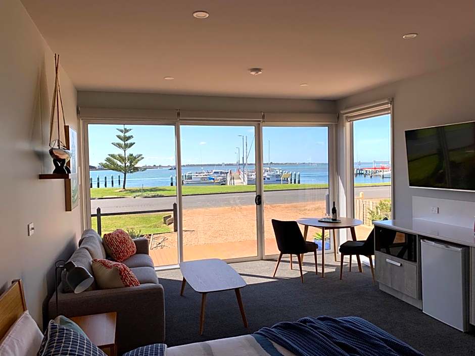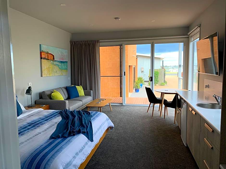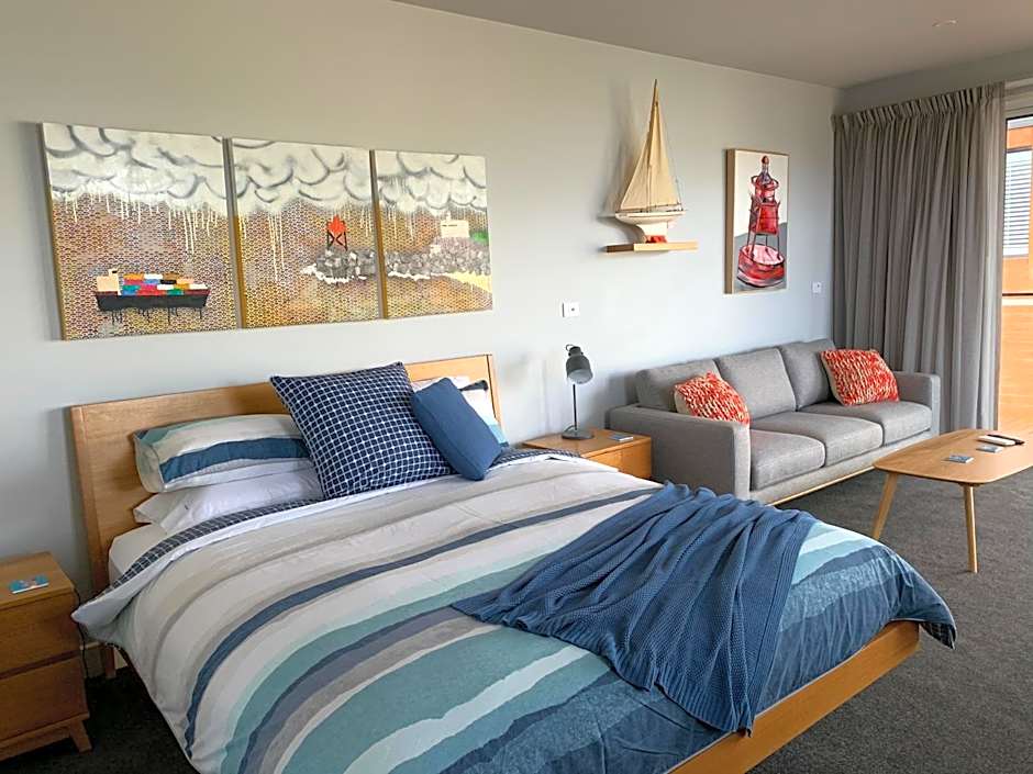 Three studio options—Harbour View, Harbour View with Balcony, and Waterfront—each span 344 square feet and sleep two adults and one child on a king-size bed. All are non-smoking and come with kitchenware and a private entrance, giving guests flexibility and privacy during the stay.