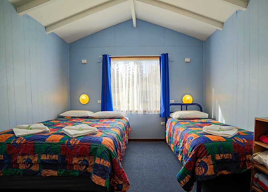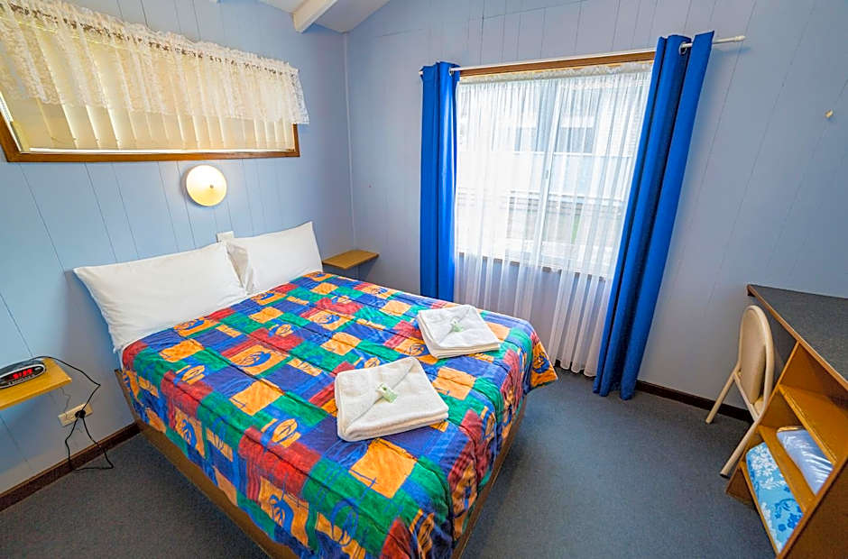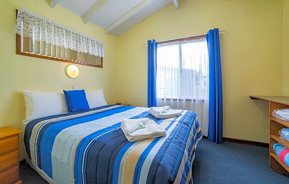 This wheelchair friendly 2 bedroom chalet features 2 queen beds and 1 single bed. It is fully self contained with a full kitchen. There are grab rails in the shower and toilet.