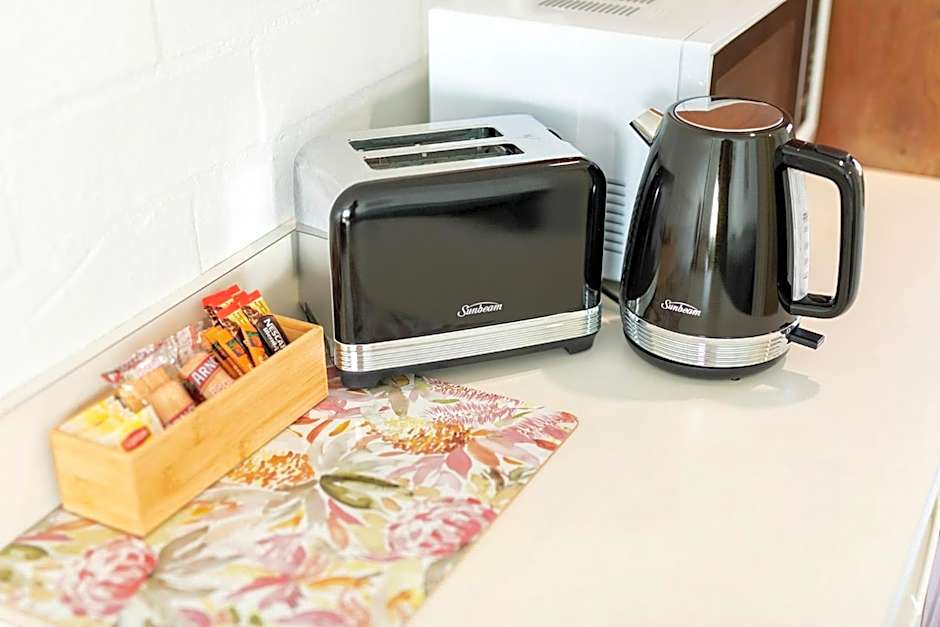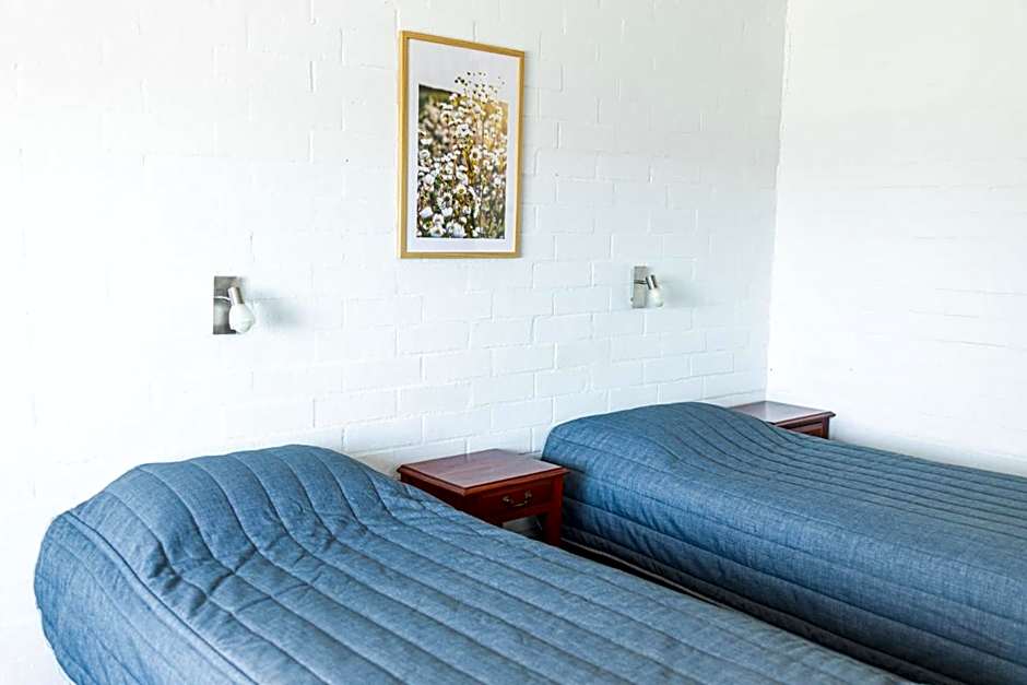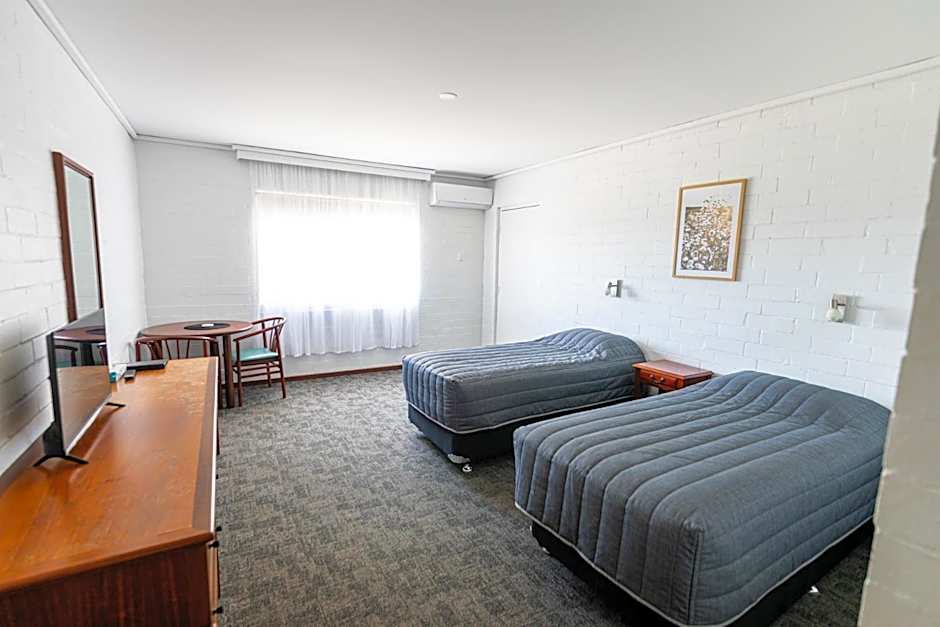 This standard motel style room has a queen and one single bed. There is a toaster, kettle, tea and coffee making facilities and a small fridge. The room is spacious and quiet.