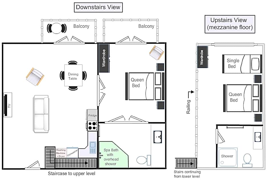 Please note an internal staircase leads up to the 2nd bedroom, which has 1 queen bed and 1 single bed as well as a bathroom with a shower. This open plan, loft style room is on a mezzanine floor. All apartments are on the 2nd floor of the resort building, accessed via a high staircase, with under cover parking available.