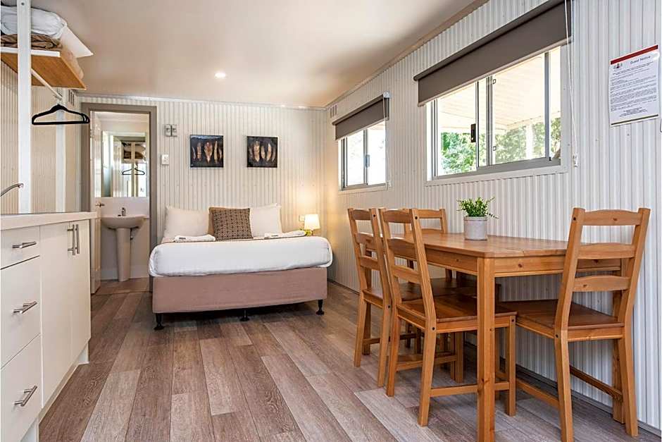 Recently refurbished, this open-plan cabin has no bathroom/ensuite. However, shared ablutions are just a short walk away. Cabin features a queen bed, kitchenette with microwave, bar fridge, electric frypan and utensils. The lounge area has a flat screen TV table and chairs, along with reverse cycle air-conditioning/heating. Complimentary tea, coffee and sugar are also provided and undercover parking is available adjacent to the cabin.