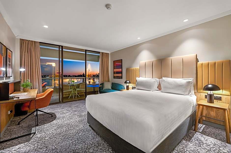 This room features a bathrobe, air conditioning and seating area. Offers private balcony with views of Swan River and the South Perth Foreshore.