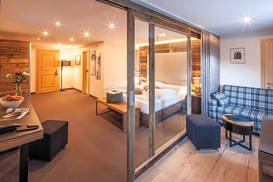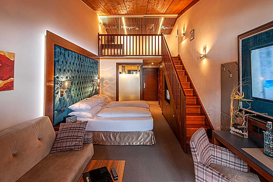 Spacious junior suites with a large double bed and a gallery with two single beds. Featuring a flat-screen TV, a safe and a balcony with mountain view.