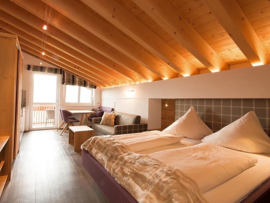 Accommodation options range from the Double Room, which sleeps up to four adults with a sofa bed and a queen bed, to Apartment, 2 Bedroom; Suite Og, 2 Bedroom; Suite Og, 3 Bedroom; Wellness Suite; and Studio. A selection also includes Apartment Annex Building, 1 Bedroom; Room With Mountain View; Room, Balcony; and more, with many units offering a balcony and garden or mountain views, and some featuring a kitchen or kitchenette.