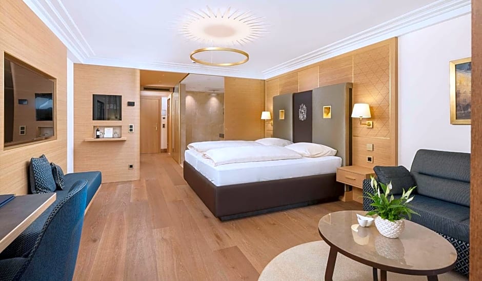 Hugh room (superior), beautiful old style hotel, very good breakfast , not crowded, great balcony, hugh cool underground garage. We asked for kettle and cups for the room and received immediately. Easy access to Salzburg with car.