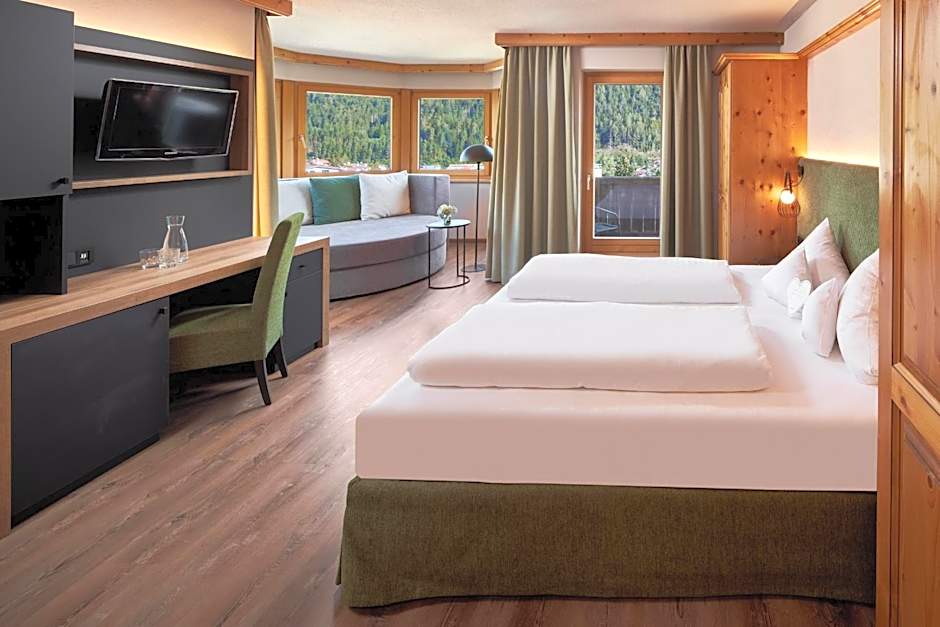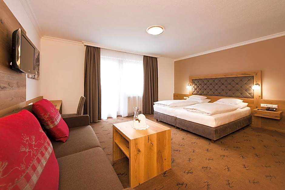 The Alpinresort Stubaierhof ****s offers double rooms with and without balcony. The rooms are non-smoking and can accommodate 2 adults with no children. The double rooms have either a king-size bed or a king-size bed and a sofa bed. The room sizes range from 237 sqft to 291 sqft.