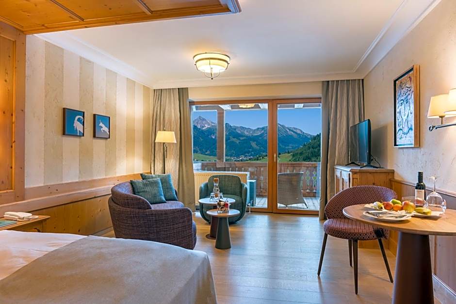 Very spacious room featuring panoramic mountain views, a flat-screen satellite TV, a mini-bar, and a bathroom with a shower, bathrobes, and a hairdryer.
