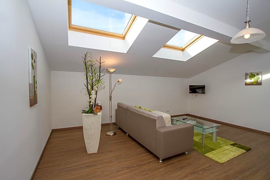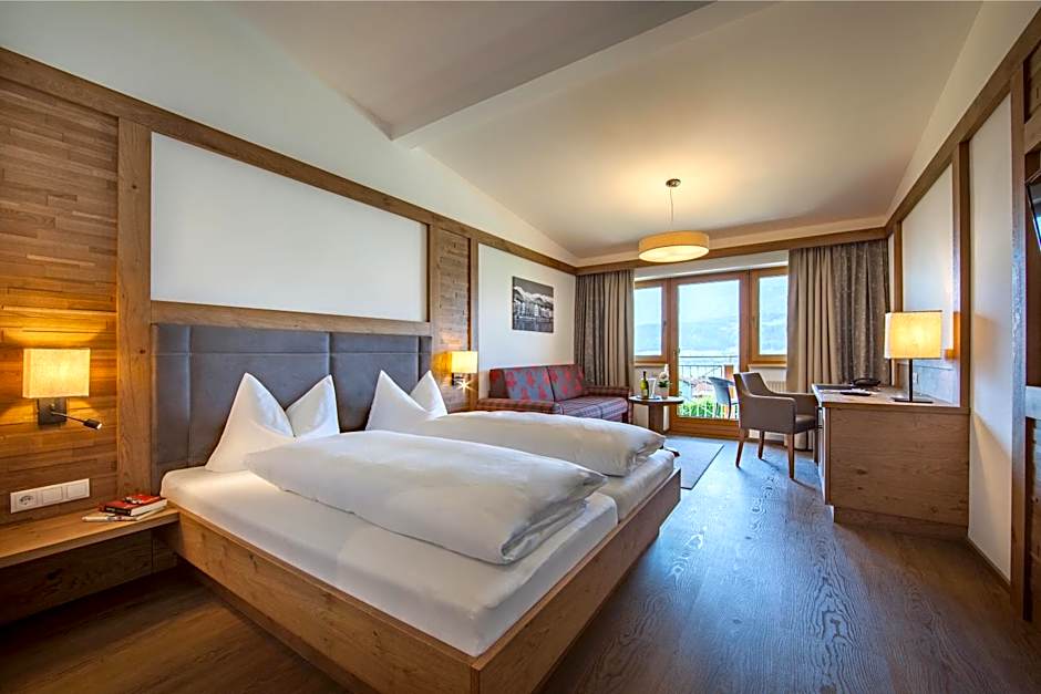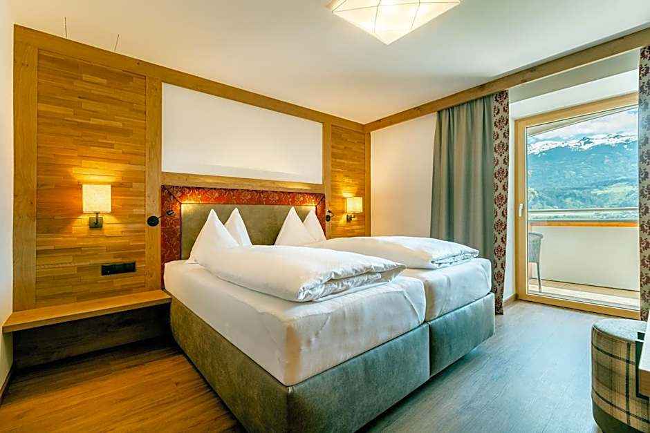 Room options span several styles, including Superior, Classic, Business, and Family Apartment configurations. Some arrangements feature balconies, King beds, or sofa beds, and kitchen facilities support longer stays. Elevators provide easy access to upper floors, and many layouts offer balcony or garden views to complement the alpine atmosphere.