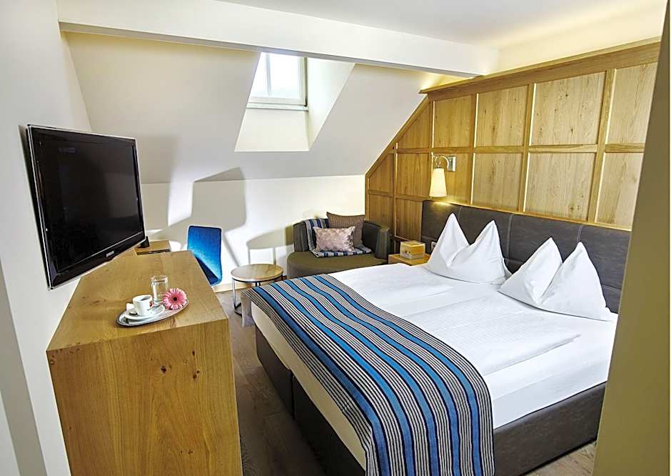 Double Room Mansarde Altstadt (no view) (1 King Bed) is 237 square feet and includes a double bed 131-150 width plus desk, satellite tv , hairdryer, tea and coffee making facilities , safe, bathrobes, and slippers.