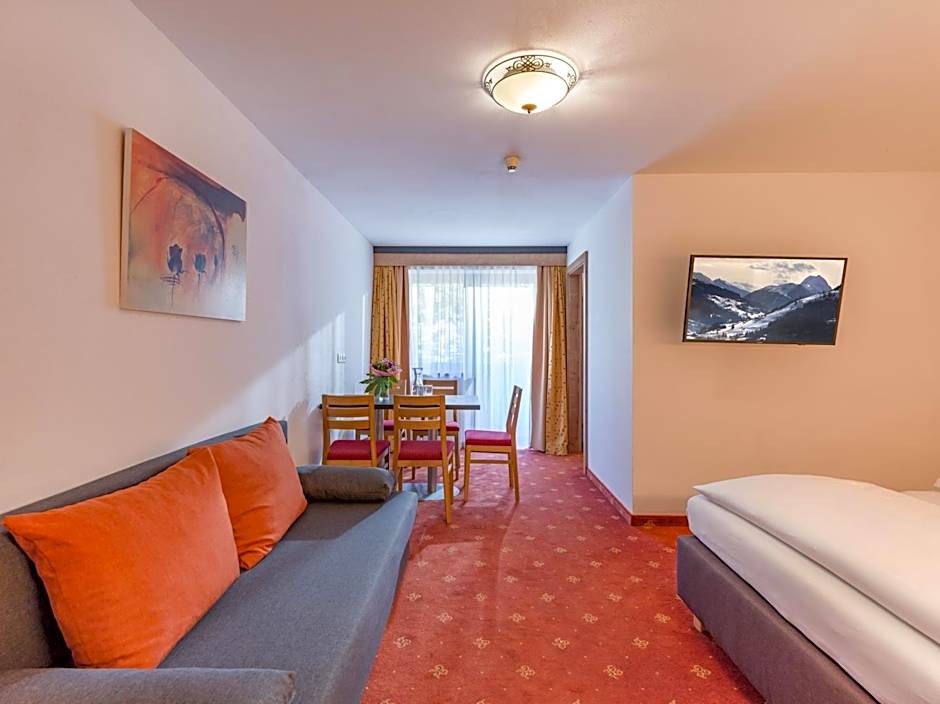 We got a better room than we have booked. The place was nice, quiet, the room had a little fridge which was sufficient, and the furniture was all grey and wooden-like, making the room nice and cosy. There was enough space for exercising, as well as for drying the clothes after skiing. Every day there was a possibility to use sauna and wellness zone (which is really nice after snowboarding or skiing the whole day). The hotel is close to cable cars and there's no need to use a car as the buses go regularly all around the place (and the bus stop is +/- 4 min from the hotel). The breakfast was perfect, with a large selection, every day slightly different; even for people with allergies. We were really happy with the accommodation :)