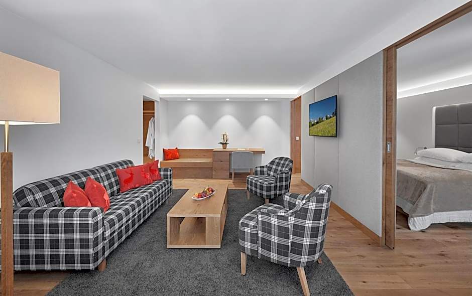 Elegant, approx. 131 ft² junior suite with fabric-covered wall panels and balcony. Bathroom with bathtub and shower, separate toilet, hairdryer, cosmetic mirror, TV, WiFi, safe, mini-bar, bathrobe and slippers. The Junior Suite can be combined with a Double Room Deluxe "Tirol" via a connecting door.