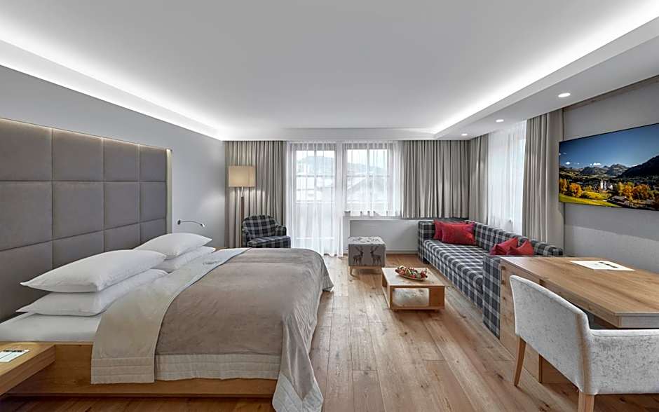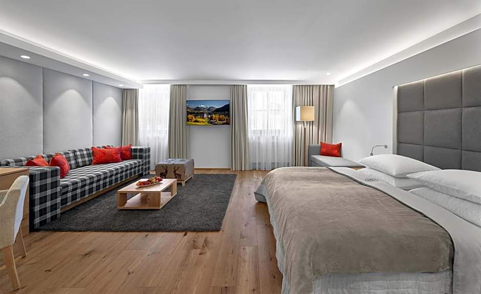 Stylish and spacious room with oak-wood floors, featuring a seating area and a modern bathroom with bathtub and shower. Most rooms feature a balcony. The room can be combined with another Double Room Deluxe "Tirol" or a Junior Suite "Hahnenkamm" via a connecting door.
