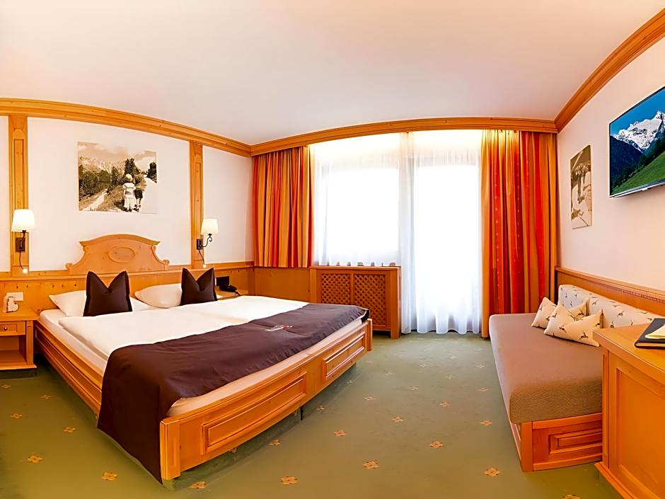 Cozy Deluxe Double Room (Apartment "Elfer") - approx. 171 ft² and equipped with a separate, comfortably furnished bedroom with a double bed and a Smart TV, a cozy living room in Tyrolean country style with a seating area and tiled stove, a sofa bed with a sleeping arrangement (less comfortable) for 2 additional people, a Smart TV with hotel information channel and streaming apps such as Netflix, Amazon, and YouTube (simply log in to your account via QR code, stream, and be securely logged out automatically). This room also has a bathroom with a bathtub with shower attachment, hairdryer, cosmetic mirror, double sink, separate toilet, radio, safe, telephone, free Wi-Fi, and a south-facing balcony (for 2-4 people)