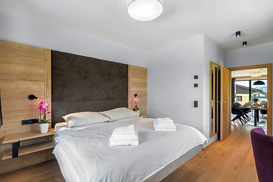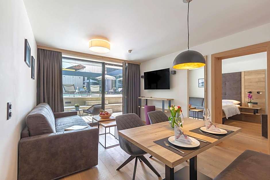 With spacious, modern apartments directly by the pool, the Emma Deluxe Aparthotel offers the perfect accommodation for your stay in Piesendorf. Our Two-Bedroom Apartments comfortably accommodate up to six adults and feature two queen-size beds and a sofa bed. If you're traveling in a smaller group, our One-Bedroom Apartments are ideal, accommodating up to four adults with a queen-size bed, bunk bed, and sofa bed. With non-smoking and soundproof rooms, you can relax and unwind after a day of exploring. Plus, with a well-equipped kitchen or kitchenette, you can easily prepare your meals and enjoy them with a breathtaking view from your apartment.