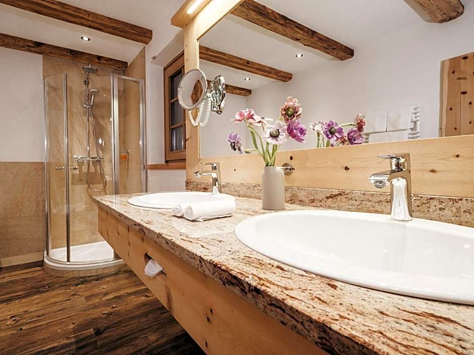 Spacious, south-facing suite with a balcony or terrace overlooking the mountains, natural wooden floors, a bedroom with a king-size bed, a living room with satellite TV and a tiled stove, a bathroom with natural daylight, and a separate toilet. The suite is furnished with wood from the 16th century.