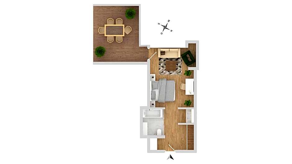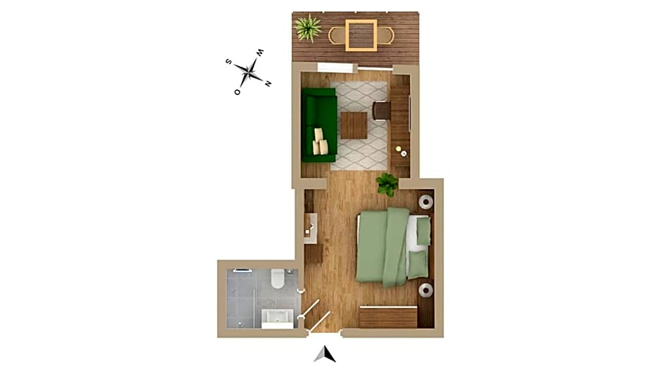 Spacious room with a south-facing balcony, a large living area with flat-screen TV, a mini-bar, safe, hardwood floor, and a bathroom with bidet.