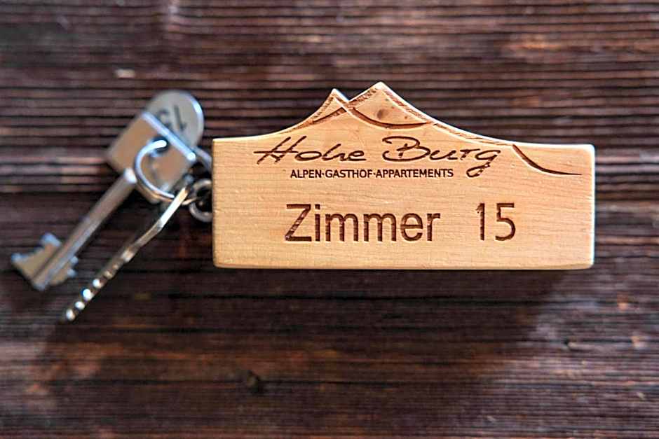 On-site dining is provided by Alpengasthof Hohe Burg, offering Traditional and Modern ambiances. Two room types are available: Apartment, Mountain View and Room With Mountain View; both non-smoking and accommodating 2 adults and 1 child. Accepted payments include Cash, Visa, Mastercard, and Maestro.