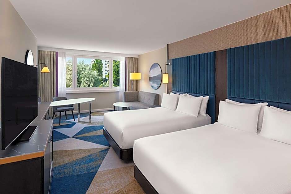 The Hilton Vienna Danube Waterfront offers a variety of rooms, including Twin rooms, Double rooms, Suites, and Family rooms. All rooms are non-smoking and have an average size of 431 sqft. The rooms can accommodate between 2 and 7 adults, with bed options including Double beds, Queen beds, and King beds.
