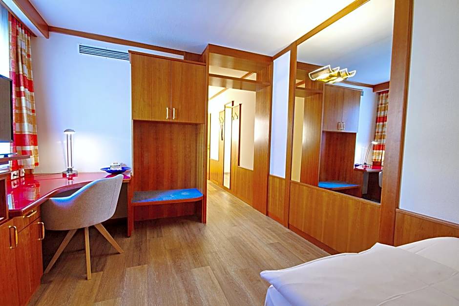 This single room features a mini-bar, cable TV, a separate toilet, and a bathroom with a bathrobe. The room is fitted with parquet floors and offers tea and coffee making facilities.