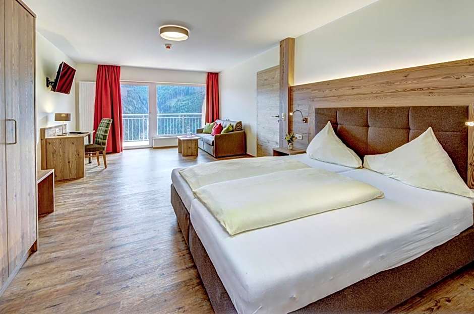 Berghotel Jaga-Alm offers a variety of rooms including double rooms, suites, and family rooms. The occupancy ranges from 2 to 4 guests per room. Bed sizes vary from twin to king, and room sizes are spacious with some accommodations featuring balconies overlooking the mountains. Smoking is not permitted in any of the rooms.