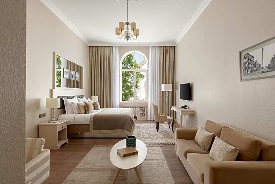 Offering one bedroom and one living room, this Executive suite is air-conditioned and carpeted. A king-size bed or twin beds are featured. Digital safety deposit box and flat-screen TV with satellite channels are provided. Living room includes a seating area with sofa and desk as well as a fireplace. Bathroom amenities include dental and shaving kit as well as hairdryer, bathrobe and slippers. Guests can make use of complimentary coffee/tea in the room. Daily housekeeping is included and turn-down service is available.