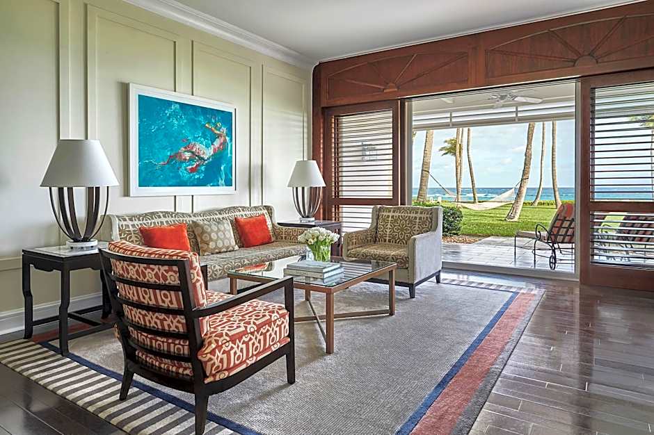 Located in the Crescent Wing, slightly secluded from main amenities for a peaceful, exclusive atmosphere. Interiors by Adam D. Tihany in a Traditional Bahamian décor. This wing offers hammocks throughout the gardens, direct ocean views and is located just steps from the beach. This room features mahogany furnishings, hardwood floors and colorful tropical flourishes. Louvered doors open to a private terrace or balcony with direct ocean views. One marble bathroom with two vanity sinks, private bathroom, separate shower and large oval tub.