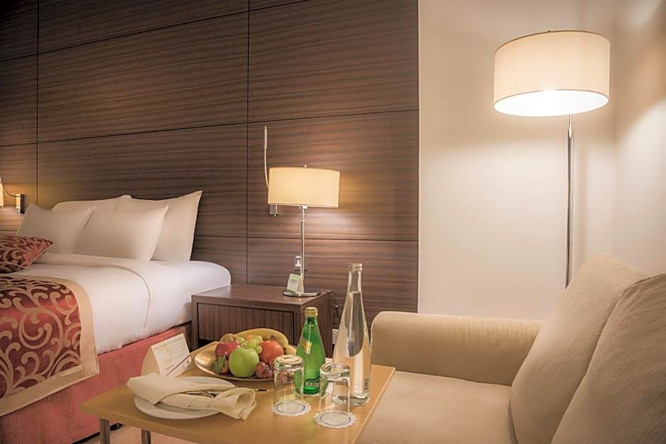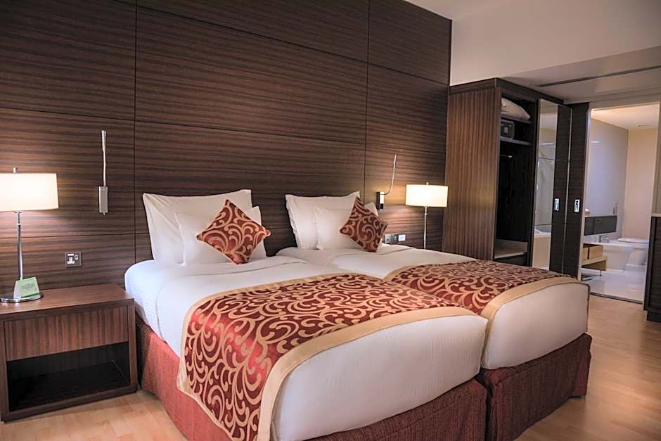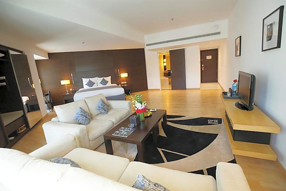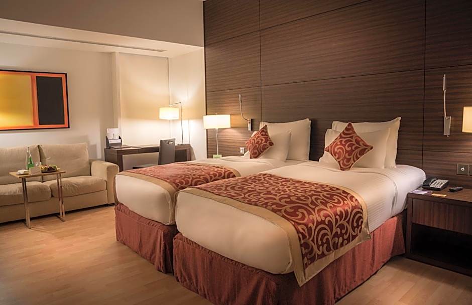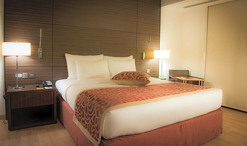 On-site dining adds flavor to every stay. The Gallery serves Middle Eastern, Local, and International fare with a family-friendly touch, while Beef Garden brings American dishes in a modern, romantic setting. For sun-soaked days and city views, the rooftop outdoor pool is all-ages, inviting guests to take a refreshing dip above the bustle of the streets.