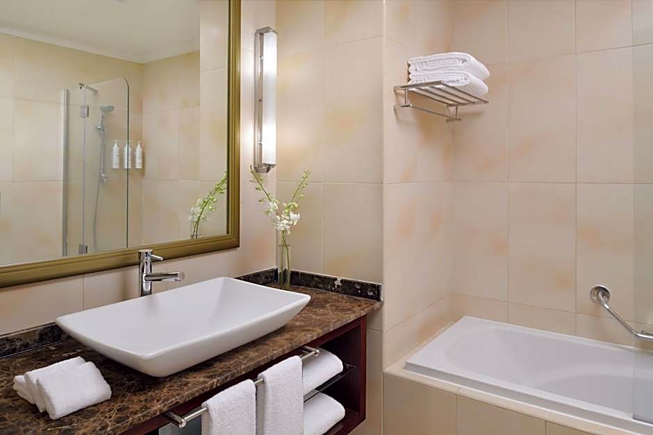 At Marriott Executive Apartments Manama, Bahrain, guests can enjoy a range of leisure amenities. They can spend their time lounging by the outdoor swimming pool, which features a shallow end and offers a view. There is also a separate kids' pool available for families traveling with children. The hotel also has a water park, offering fun-filled activities for guests of all ages.