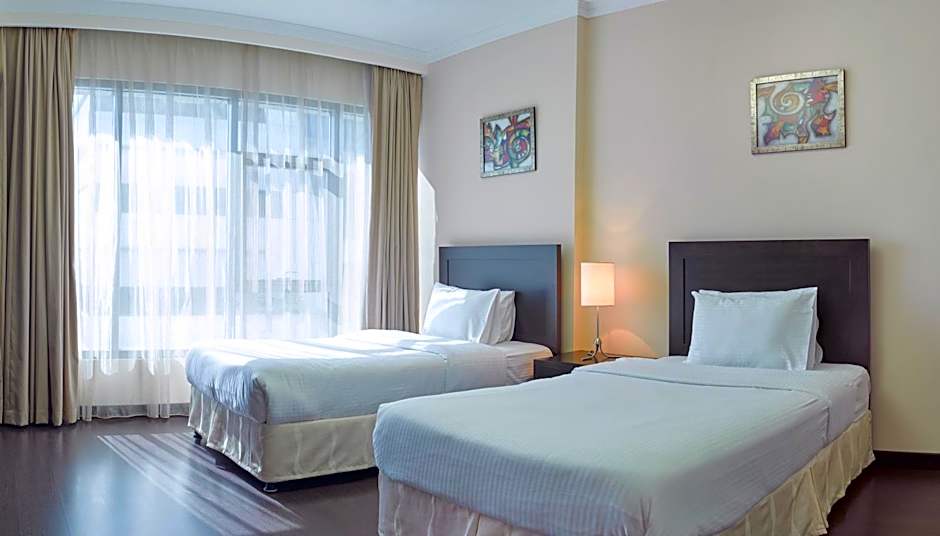 The Tulip Hotel & Suites offers a One-Bedroom Apartment with City View for single occupancy, with a room size of 926 sqft. Smoking is not allowed in this room, and it can accommodate 2 adults and 2 children with a double bed available. Another option is the Two-Bedroom Apartment with Panoramic View, which has a larger room size of 1475 sqft. This room does not allow smoking and can accommodate 4 adults and 2 children with 2 twin beds and 1 double bed.