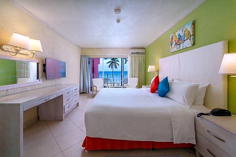 Every room is air-conditioned and well appointed with Caribbean style décor, private bathroom, balcony or patio and all units have telephone with data port and voice mail, radio, television with satellite, kettle, fridge, hairdryer and room safe. Most rooms have wireless access and you will find ‘hot spots’ in some public areas. Safety deposit boxes are available at the Front Desk free of charge. The ocean view rooms offer a stunning view of our beautiful beach. All of our rooms have balconies or patios so that you can bring a little bit of the ocean breezes into your room.