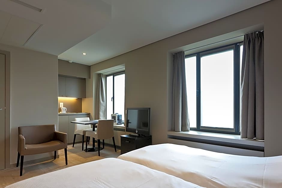 Room choices span a range from Studio and Twin layouts to Apartments with 1 Bedroom and Kitchen or Kitchenette, plus Family Apartments and other twin-based options. This variety helps match different itineraries, whether traveling solo, as a couple, or with family, ensuring a comfortable setup for every stay.