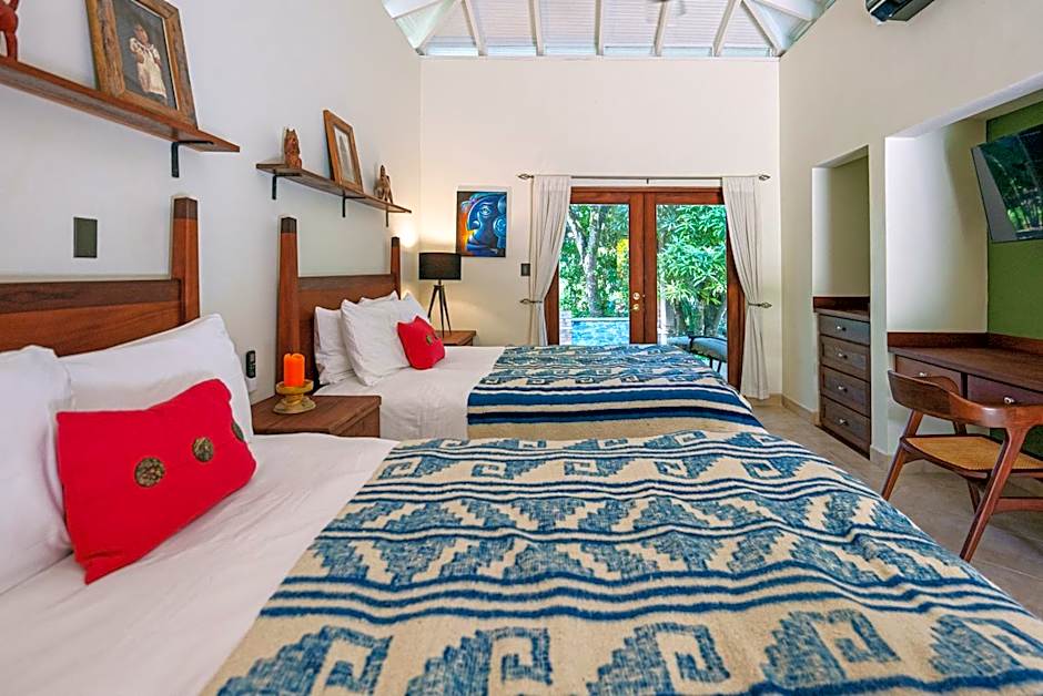 Room options span Casita Suite (398 sq ft) with two Queen beds, Villa, 1 Bedroom (1195 sq ft) with a King bed, Master Suite (700 sq ft) with a King bed, and Balam Suite (301 sq ft) with a Queen bed. All accommodations are non-smoking.