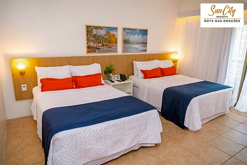 At Sun City Rota das Emoções, every moment is a chance for unforgettable adventures! Your days can be packed with high-energy activities, whether you're gliding down waterslides at our water park or casting your line in the beautiful beach waters. Families can gather for games at the vibrant kids’ club while adults kick back and sip on colorful cocktails by the pool. Feel like exploring? Stroll around our lush panoramic gardens where the gentle sea breeze accompanies you, or kick off your shoes and build beachfront sandcastles. With each hour, you can create a treasure trove of joyful memories.