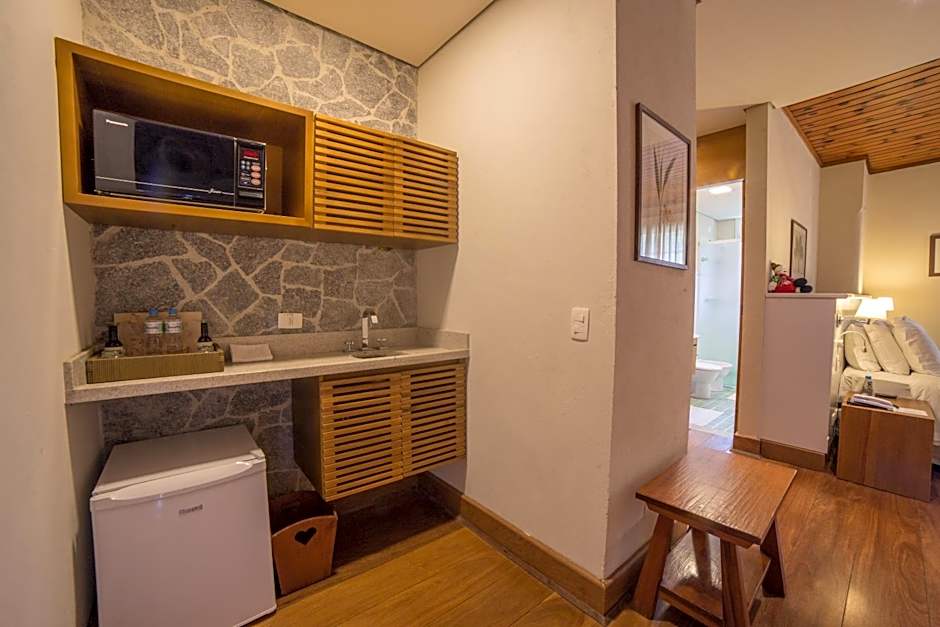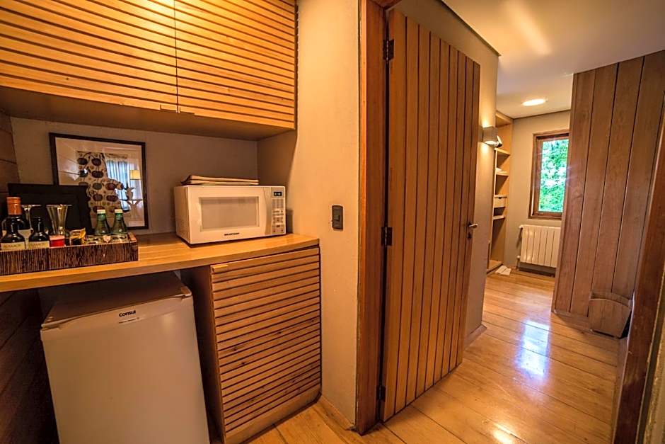 This chalet features a balcony panoramic wood views and is located 328 feet from the main building. It offers a seating area with a sofa bed and fireplace, and a flat-screen TV. There is a fully equipped kitchenette with a microwave and refrigerator. The private bathroom features a bath.