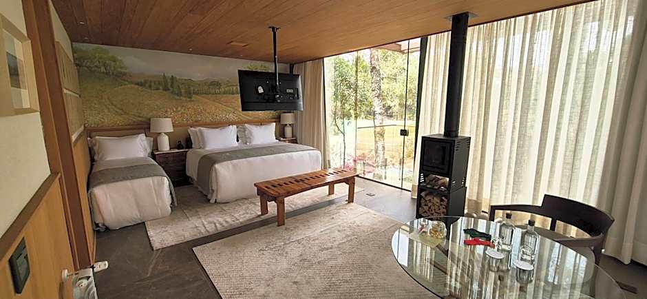 Featuring a view of the woods, this room features a 32" LCD TV, dining table for 2 people and king-size bedding.