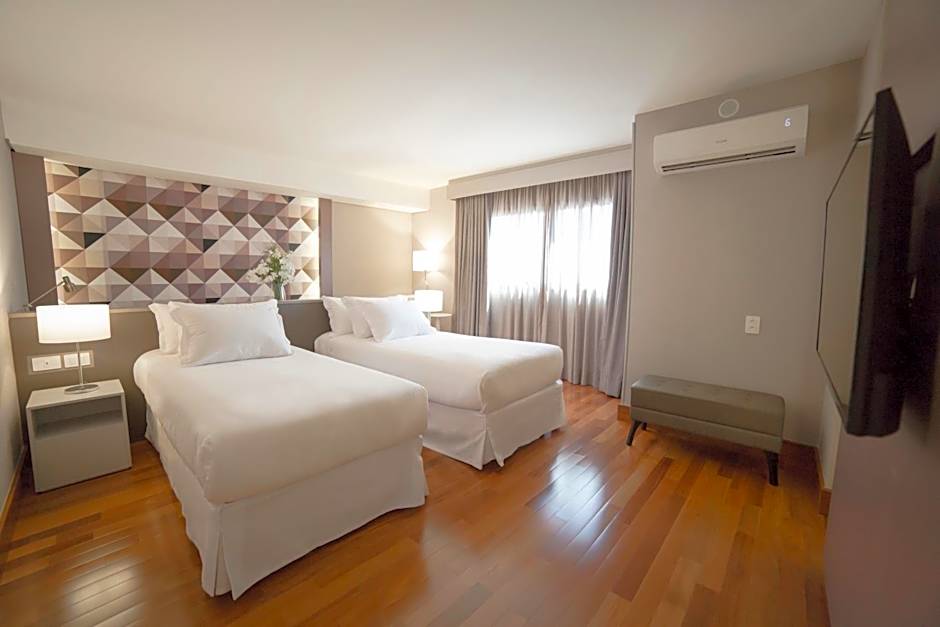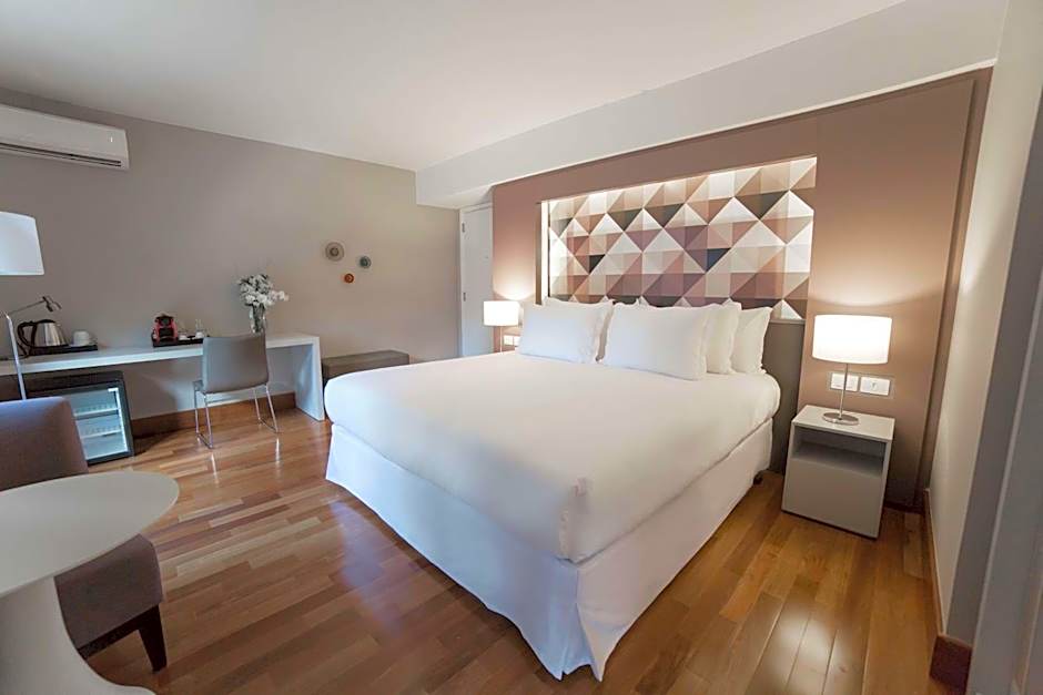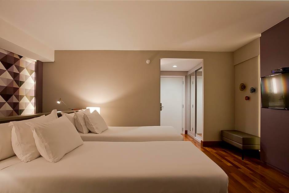At NH Curitiba The Five hotel, guests can choose from a variety of room types, including Premium Twin Rooms, Standard Twin Rooms, Standard Family Rooms, Deluxe Suites, Standard Double Rooms, Deluxe Double Rooms with Balcony, and Premium Double Rooms. Smoking is not allowed in any of the rooms. The rooms can accommodate either 2 adults and 1 child or 3 adults and 2 children. The beds range from Twin beds to Queen and King size beds. Room sizes vary from 366 sqft to 764 sqft.