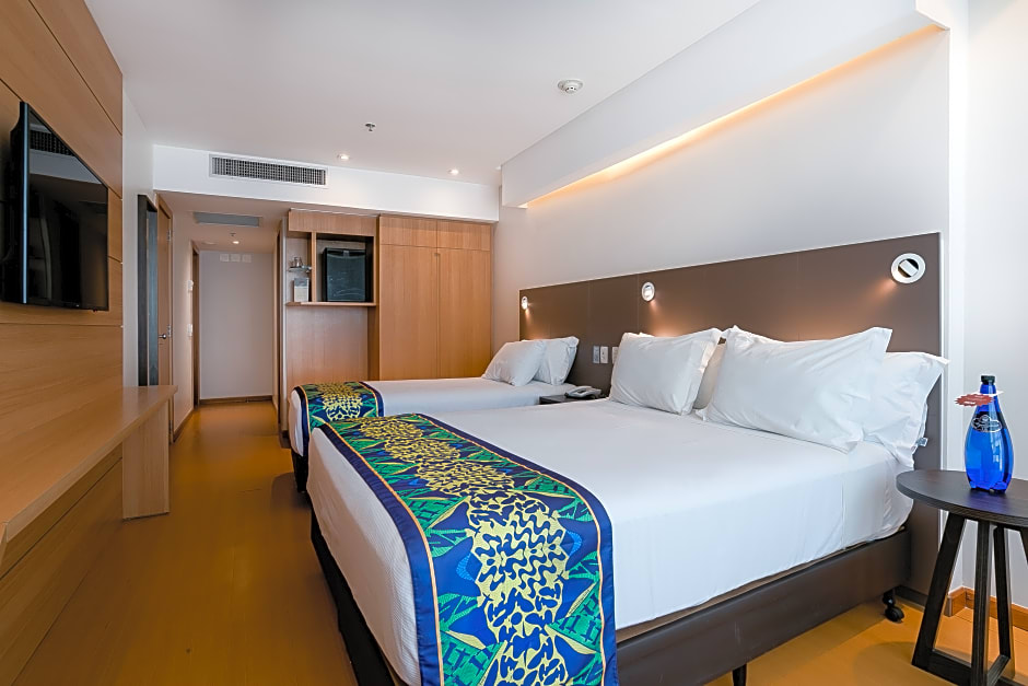 This triple room faces the Copacabana beach and offers a Double bed and a single bed. It has LCD TV 32” with cable, wi-fi internet access, anti-allergic floor, electronic safe box, acoustic windows, central air conditioning. Non-smoking room.